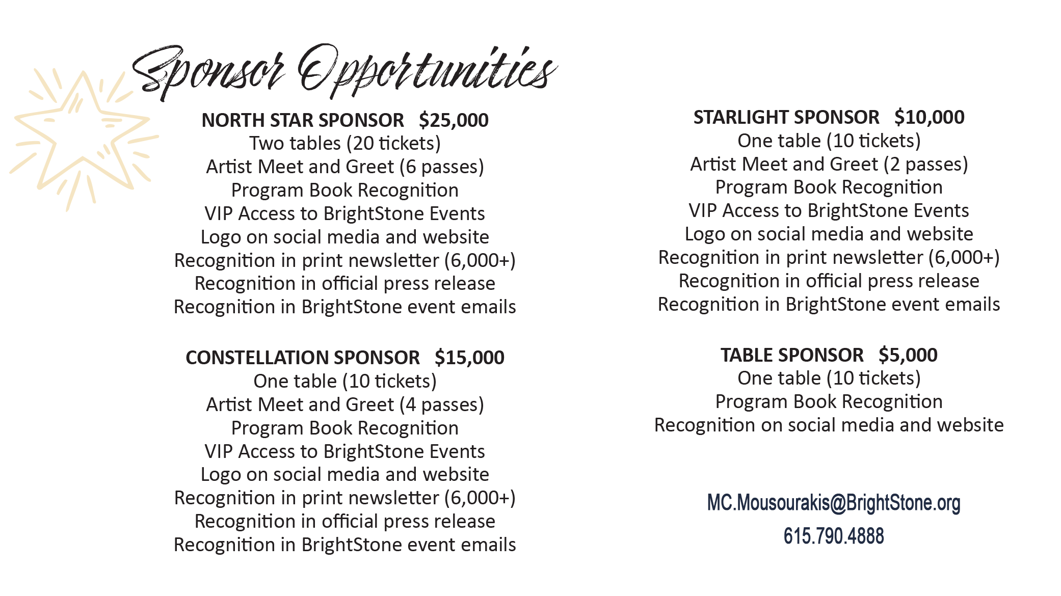 All proceeds from A Night Full of Stars benefit BrightStone's educational programs supporting adults with intellectual and developmental disabilities. The evening will include a special concert performance by GRAMMY, ACM, CMA and CMT Award-winning Country star Carly Pearce, plus the BrightStone student show choir, a silent auction, reception, and dinner.