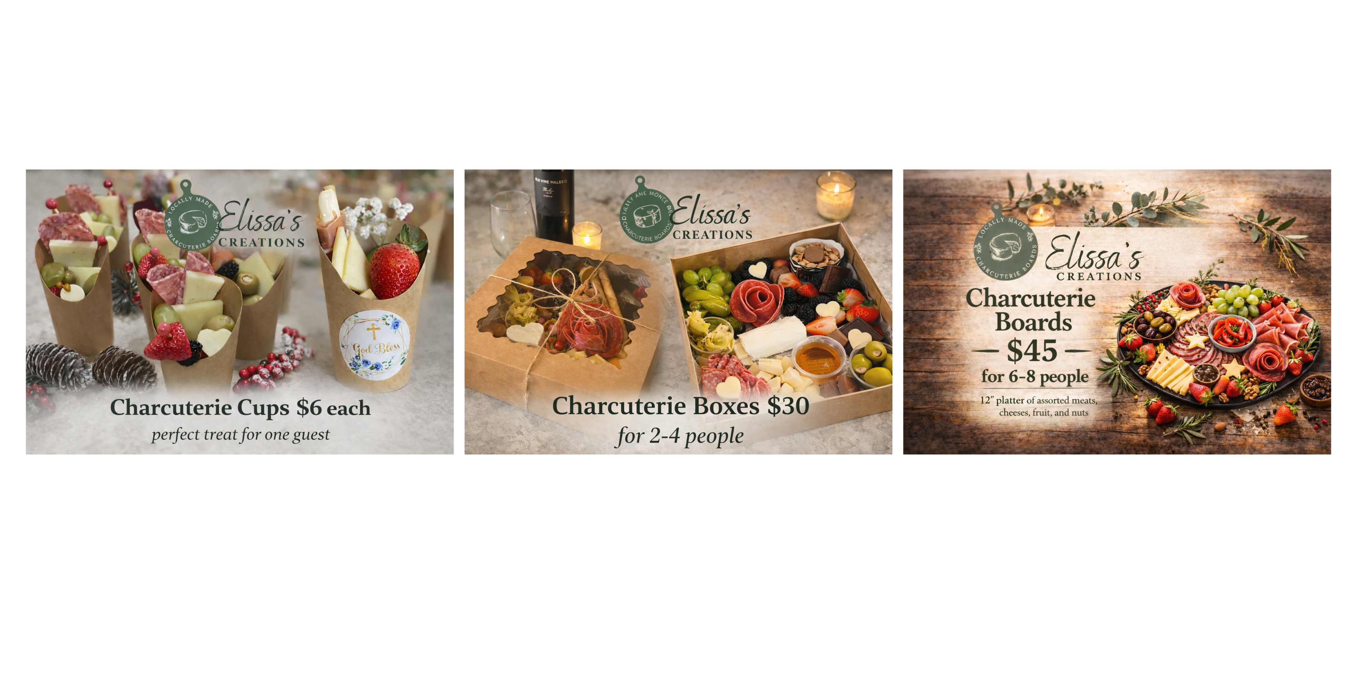 Charcuterie cups, boxes, and boards by Elissa's Creations are available for pre-purchase through the link above and will be delivered right to your table.