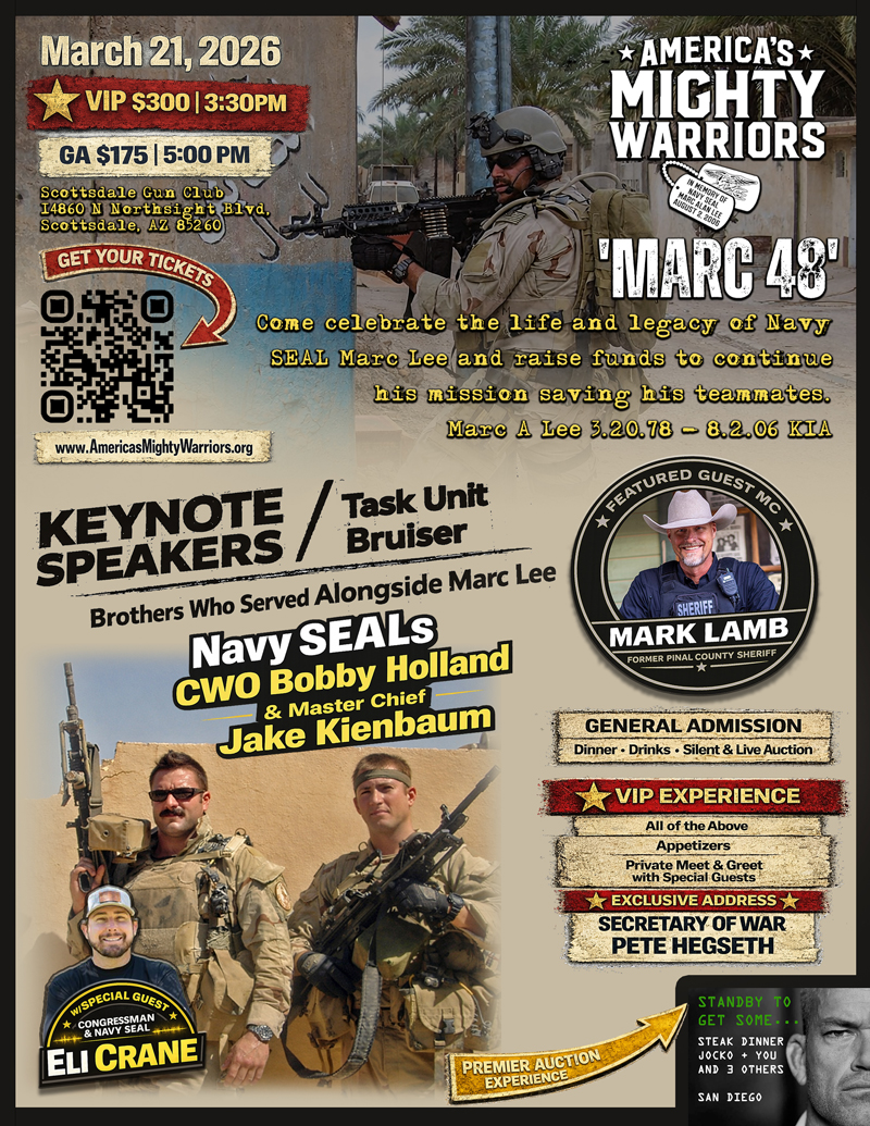 Join us as we honor the life and legacy of Navy SEAL Marc Lee on what would have been his 48th birthday. Marc carried the MK48 in battle to protect his teammates - and made the ultimate sacrifice doing so. This evening brings our community together to celebrate his life and raise funds to continue the mission he believed in: supporting our troops, veterans, and the families of the fallen through America's Mighty Warriors.