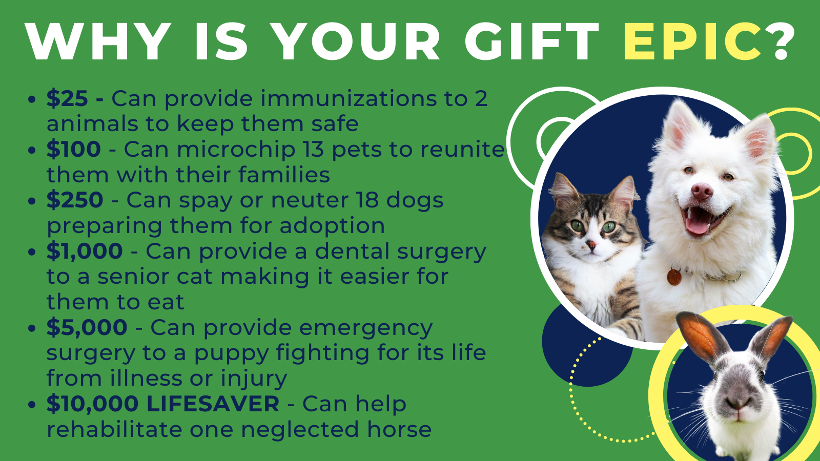 It's as simple as that. Your support fuels our mission as a no-kill animal welfare agency. Thousands of animals depend on us each year, and we don't receive government funding. We're not affiliated with state or national groups - 100% of our programs and services come from grants, sponsorships, and donors like YOU. That's what makes it truly EPIC!