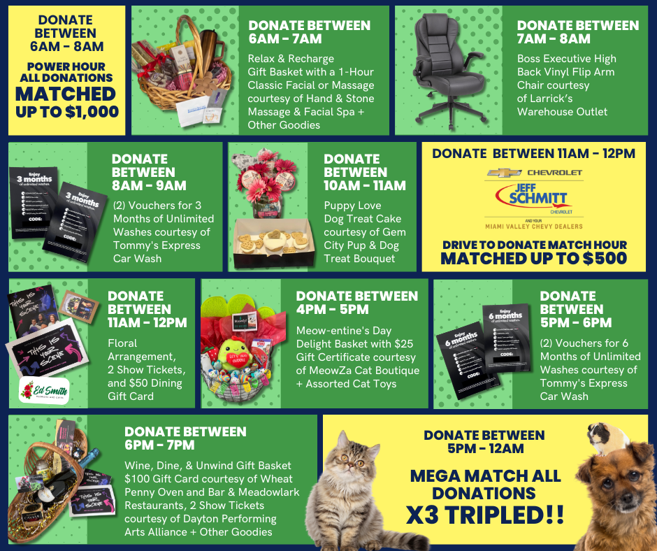 Tune in to ABC 22 and Fox 45 for an unforgettable experience. Follow us on social media at the Humane Society of Greater Dayton and Dayton 24/7 Now for exclusive giveaways throughout the day to reward our amazing donors!