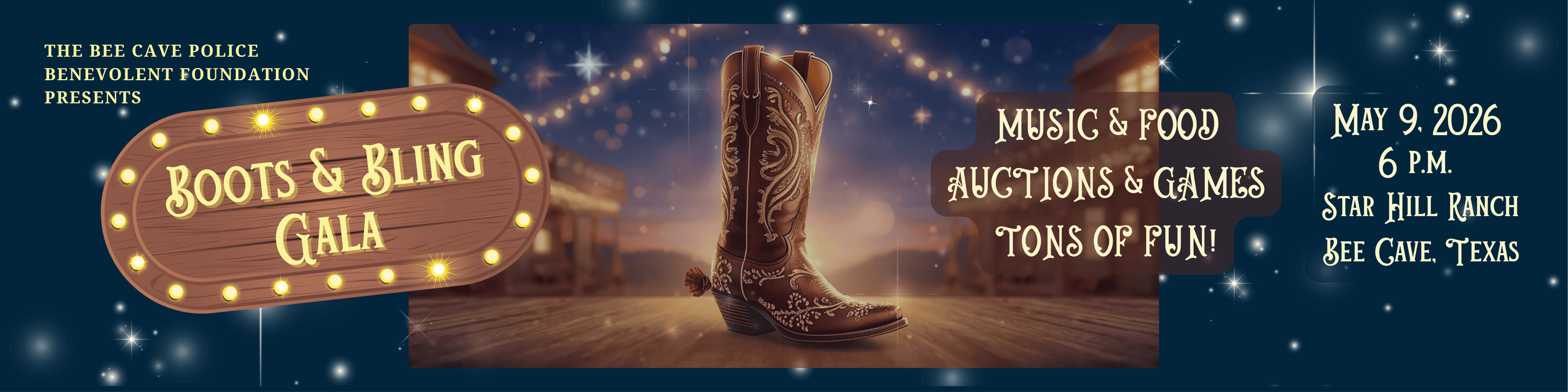 Join us on Sat. May 9th, 2026 from 6-10pm for the Bee Cave Police Benevolent Foundation's annual Gala as we recognize and support local law enforcement officers and the brave officers of the Bee Cave Police Department. We'll enjoy a night of "Boots & Bling" at our very own Star Hill Ranch with tons of fun and entertainment including whiskey tasting in the Saloon, food, music, auctions and more! Buy your table today, invite your friends and join us for a night of Boots & Bling!