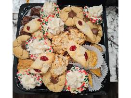 Assortment includes items such as: Assorted Cookies, Cinnamon Buns, Almond Torte Cupcakes, The Finest Baklava, and more.