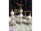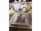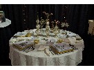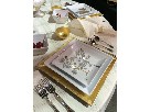 Dinnerware setting for 12 Holiday elegance is redefined with square art worthy plates set on shimmering gold chargers. Delightful reindeer, snowflakes, and glass ornaments fulfill the centerpiece A hint of cranberry red accents the silver and gold decorations of this lovely table set.