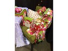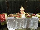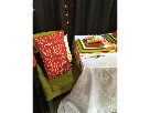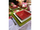 Dinnerware setting for 8 Red and lime green with a splash of pink make this table perfect for a holiday birthday celebration. A tiny pink tree and a birthday cake lend to the party atmosphere. This festive table display includes two fun green chairs with pillows and an elf. BUY NOW PRICE: $787