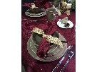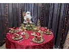 Dinnerware setting for 8 Rustic Christmas memories await the family that dines with this fur-lined St. Nicholas who has come to wish all a Merry Christmas. Birds, twiggy branches, and pine boughs complete the rustic centerpiece, while an embossed red tablecloth adds bright color. Peaceful birds grace the table surrounding their homey nest. This table setting will find a place in your home too.