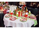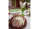 Dinnerware setting for 8 Eight of Santa's best helpers are sure to enjoy a festive meal around this cute table. Bright red and green stemware, polka dots, chevrons, and candy cane stripes race along the table runner. Santa's helpers deserve a beautiful break too.