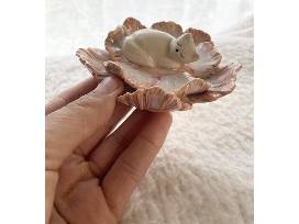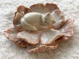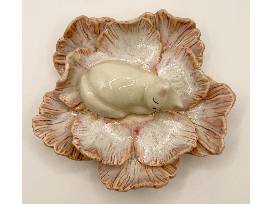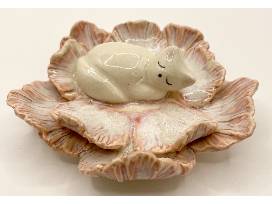 This pink flower dish is handcrafted stoneware, and each petal was carefully molded into each petal to create a full, ruffled bloom. At its very center, a tiny, creamy-white kitten is curled up, sound asleep and perfectly peaceful.