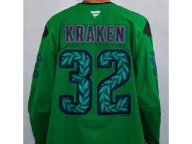 Specialty Kraken Jersey designed by Jess Phoenix in honor of Green Night on April 2, 2026. Crested with player's name & number, signed by #62 Brandon Montour, size 58 (Made in Canada).