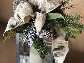 Approx. 16'' Lantern with battery operating candle inside. Decorated for a winter wonderland theme with snowy pinecone, greenery and ribbon.
