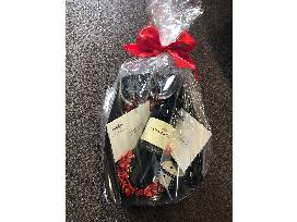 Spring Valley Lake Country Club wine basket, including a Pedroncelli Merlot wine, wine glasses with Spring Valley Lake CC Logo, gift certificates for our new Prime Rib Dinner, and Sunday Champagne Brunch, and candle.