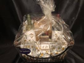 Wire basket filled with 2 Bottles of Wine, Wine Glasses, Chocolates, and a beautiful heart shaped necklace with matching earrings.