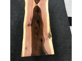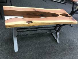 This beautiful custom made Cedar Coffee Table featuring custom slab, custom glass, and custom metal legs made at Miller Glass of Rolla.