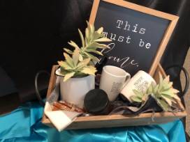 A white metal pitcher, decorative sign, soy candle, 2 coffee mugs, caramels, decorative scarf, and 3 succulents all nestled in a wooden basket - perfect for your farmhouse decor update!!