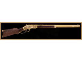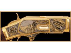 This limited edition engraved Winchester Model 1873 is chambered in the .44-40 caliber, with a 24" octagon barrel and grade III walnut stock. The rifle is plated with 24 Karat gold, nickel, and black copper to accent the receiver images. #11 of 50.