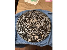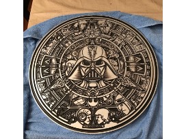 This is a wooden hand painted Aztec type calendar but with a Star Wars theme. Hang it in your home and " feel the force".