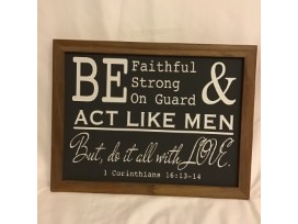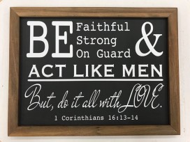 13" x 17" wood sign with 1 Corinthians 16:13 -14 displayed. "Be faithful, strong, on guard, and act like men.But, do it all with love."