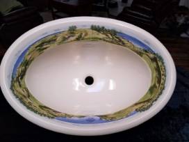 Depicting sweeping panoramas of Whistling Straits golf course and Lake Michigan beyond, this design celebrates the art of golf in the historic style of renowned late 19th-century British artist Douglas Adams. The colorful artwork embellishes a centerpiece sink, which features a unique wide-beveled ledge and generous basin size.