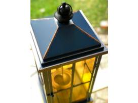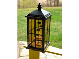Get great style indoors and out with this Rustic Lantern. A chic vintage-inspired metal frame in navy blue is set with warm amber glass panels. The antiqued powder-coated finish gives it a luxury feel while protecting it from the elements when you use it outdoors. Includes bronzetone tealight tree. Can be used with tealights, jar candles and pillars. 16¾" (43 cm) h, 7" (18 cm) w.