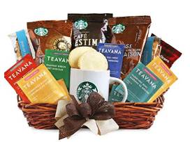 Grab your favorite coffee beans or lattes from Arabica Cafe with a $25 gift card. Sip some love (Rooibos tea from South Africa) in the comfort of your home and enjoy it with some local artisan honey. Store your teas in the tea box and steep your looseleaf tea with the infusers included in this basket. You cannot go wrong with the classics from Starbucks Daybreak Gourmet Coffee and Tea Collection and a $25 gift card.