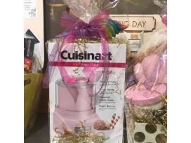 This basket is everything is you need for a fun-filled and fabulous ice cream playdate. Now you can make your favorite flavors at home in just 20 minutes or less! The fully automatic Cuisinart Frozen Yogurt - Ice Cream & Sorbet Maker lets you turn fresh ingredients into a delicious and healthy frozen treat with no fuss and no mess. Simply add your ingredients to the bowl, press ON, and the machine does the rest! After that, you can store your ice cream in colorful pink freezer containers or serve it up with fun and festive cups with spoons. Also included is a GIANT ISCREAM ICE CREAM PILLOW to help you remember all the fun you had.