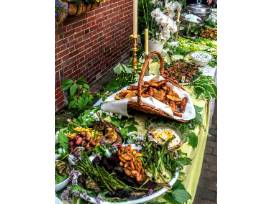 -Avocado sweet pea edamame mash and Roasted eggplant, poblano chili puree served with artisan flatbreads, fruit nut crackers and non-gluten crackers, displayed with berries, asparagus and candied nuts