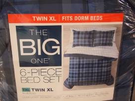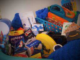 Laundry basket filled with many things that he' will need when he sets off for the dorm including a 6 piece twin sized bedding set and gift cards to spend at: