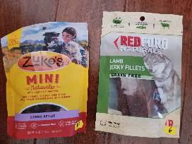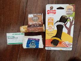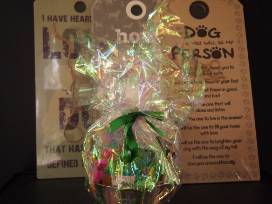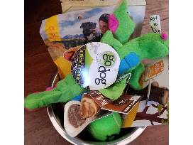 A dog basket that includes: 64 oz. bowl with silicone base, 6 oz. Zuke's Mini Naturals plus vitamins and minerals Rabbit Recipe dog treat, 4 oz. Redford Naturals Lamb Jerky Fillets Grain Free dog treats, Go dog chew guard and ball, RedBarn Peanut Butter Flavored Filled Bone, Earth Animal No Hide Venison Recipe Dog Chew 4 inches, and Maple Bacon Flavored Nylabone.