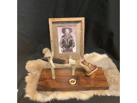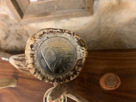 This Pistol Pete knife is one-of-a-kind custom-made, handcrafted and is very special, rare and a unique art piece. Made by artist and one-of-kind custom knife maker Roger Brewer of Edmond, Oklahoma. When you look at this carving, it looks back at you in the image of Frank Eaton, OSU's own Pistol Pete. The knife was carved with perfection in that nothing had to be repaired, fixed or patched. Made with Steel-S35VN high-quality stainless steel known for holding an edge, copper was electroplated on the blade. The handle is made with Axis Horn.