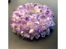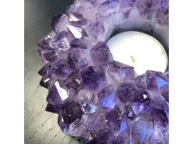 The Amethyst tea light holder is made of authentic amethyst quartz to create the ultimate look in dramatic candlelight. The gorgeous crystals surround the included tealight candle, emanating light through the semi-transparent quartz for an ethereal ambiance.