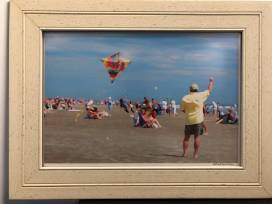 A 16x24 depiction of a sunny day on the beach. Framed in a 24x32 crisp white frame.