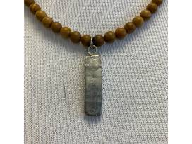 Wooden beads with turquoise accent beads, To complete the piece, a hammered silver charm dramatically hangs from the necklace.