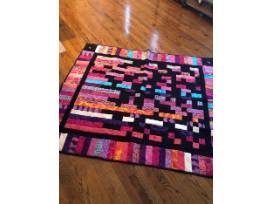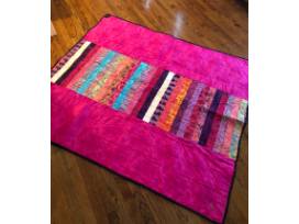 Handmade throw quilt (62" x 54"). Multi-color with pink and purple accents.