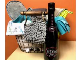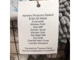 Norwex Product Basket - Envirocloth, Dust Mitt, Kitchen Towel, Kitchen Cloth, Car Wash Mitt, Car Cloth, Chenille Hand Towel, Laundry Detergent. Bottle of Luc Belaire Rare Rose'.