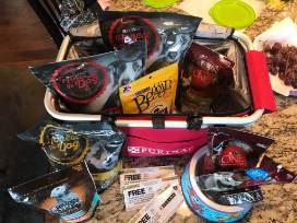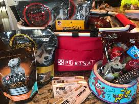 A red insulated bag filled with a variety of dog treats, 3 bags of food, 3 vouchers for large bags of food (65.00 value), leash, water bottle, 2 cans of wet dog food, and a beetle clip for your car.