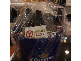 Yabo's Tacos Bucket. Featuring a $30 Yabo's Gift Card. 6 of Yabo's Signature Sauces, Yabo's Pull Over, 2 t-shirts, beer Koozies, sunglasses, and more!