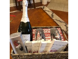 Holiday Wine Gift Basket, includes one bottle of sparkling wine, 2 Christmas Stemless Wine Glasses, Christmas Wine Stopper, and 4 Holiday Coasters.