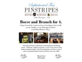 Fun for the whole crowd! Head down to Pinstripes in South Barrington and enjoy 1 hour of bowling or bocce ball and brunch for 4. Redeemable on any Sunday (some exclusions apply) Expires 4/12/20.