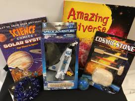 Have a blast with these various space themed toys and books from the Challenger Learning Center in Woodstock. Includes a green alien water bottle, an international space rocket poster, an international space station calendar, a pack of Neptune marbles, an Earth bouncy ball, and Aqua Launch Water Rocker, a Space Shuttle collectible replica, and a Cosmic Stone toy. Includes 3 space books and a voucher for a free family size pizza OR calzone OR lasagna from Papa Murphy's..
