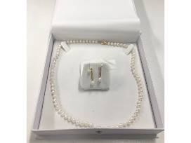 0You'll shine in this beautiful 18" strand of cultured freshwater pearls. The necklace measures 5.0 to 5.5 mm with a 14k yellow gold fishhook style clasp with a matching pair of 14k yellow gold dangle-style pearl earrings.
