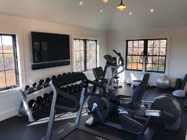 Tucked down a long driveway off of Skimhampton Road, the home features seven bedrooms, eight baths and three half baths, plus a pool & spa, tennis court, gym, pool/ping pong table, screening room, and abundant indoor and outdoor entertaining space. Cribs, high chairs, pool toys, sports equipment and toys are available.