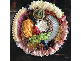 From Malt and Mold, an artfully arranged cheese and charcuterie platter for 10-15 people. Featuring at least four varieties of farmstead cheese and three varieties of artisanal cured meats as well as fresh fruit, dried fruit, jam, cornichons, honey and chocolate covered corn nuts. Please call or email 48 hours ahead of desired pick up date.