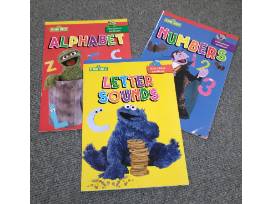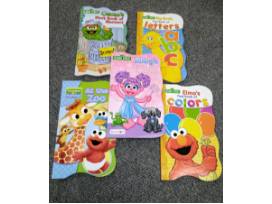 Elmo doll and autograph picture of Big Bird along with 3 work books and 5 Reading books.