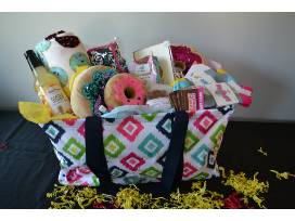 This basket is for the donut lover in you! Disney donut fleece throw, 2 donut pillows, glazed donut syrup, a bag of Jason Scott glazed donut coffee, gift coupons for $25 of free donuts and a certificate for a free coffee and donut at Dunkin' Donuts, a Thirty-one tote bag, a beach towel, a jewelry case, a bar of Merci Natrual sinfully sweet soap, 3 pair of Bombas socks, a one hour massage donated by Hand and Stone Message and a long agate stone beaded/wired wrapped necklace.