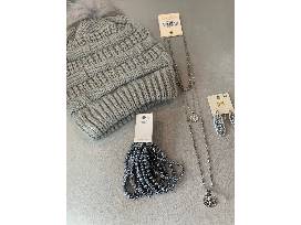 Grey knit beanie with fur pom, and silver beaded necklace, earrings, & bracelet