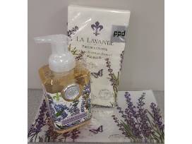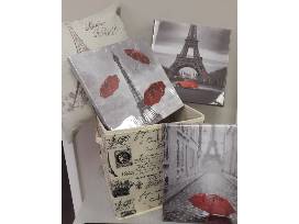 Paris themed glass tray, guest towels, lavender pump soap and jeweled mirror; pillow, pictures and storage cube.