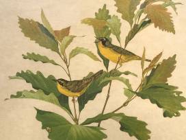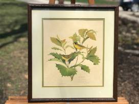 A framed print of a Kentucky Warbler by Dan Whitlatch, signed and dated.