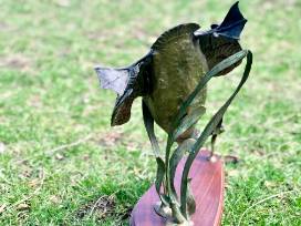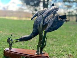 In Golden Pond is an exquisite 16-inch bronze piece mounted on a wooden pedestal, carefully sculpted by American contemporary artists Frederick Aman. This stunning piece depicts a loon in action about to snatch a meal from the cool waters beneath. Having worked successfully as a taxidermist for 26 years in Wisconsin, artist Aman is intimately acquainted with wildlife, and he works solely from memory without the aid of photographs or sketches. In Golden Pond was one of his more difficult pieces to create due to the detail and movement of his subjects. This beautiful piece is a real catch for any personal collection.