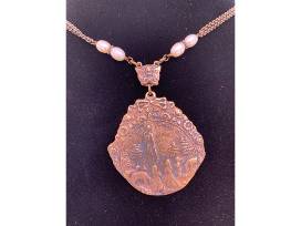 This is an original Seraphym heirloom necklace design. It is designed for longevity and quality therefore it can be passed on from generation to generation. The medals are solid bronze hand cast designs created utilizing an ancient method known as lost wax casting. The beads are genuine high-quality cream fresh water pearls. The center piece medals depict a prayerful cherub angel and the apparition of Our Lady of Fatima with the 3 visionary children at her feet.