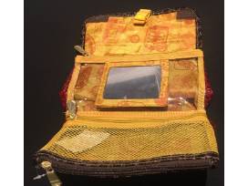 Burgundy cosmetic bag that opens up to 2 zippered pockets - one plastic and one mesh